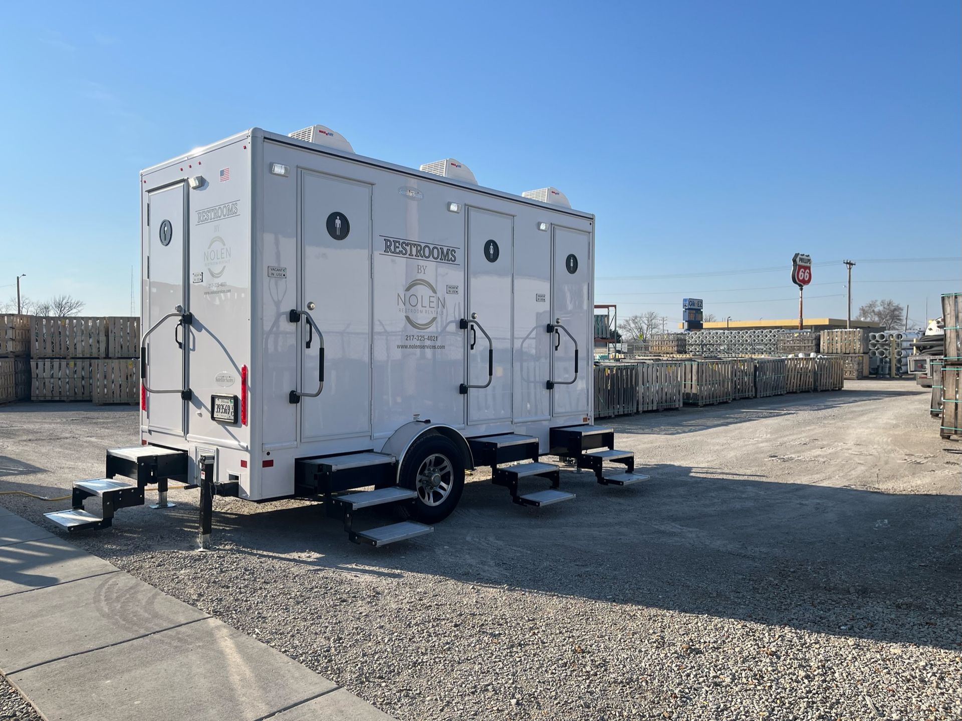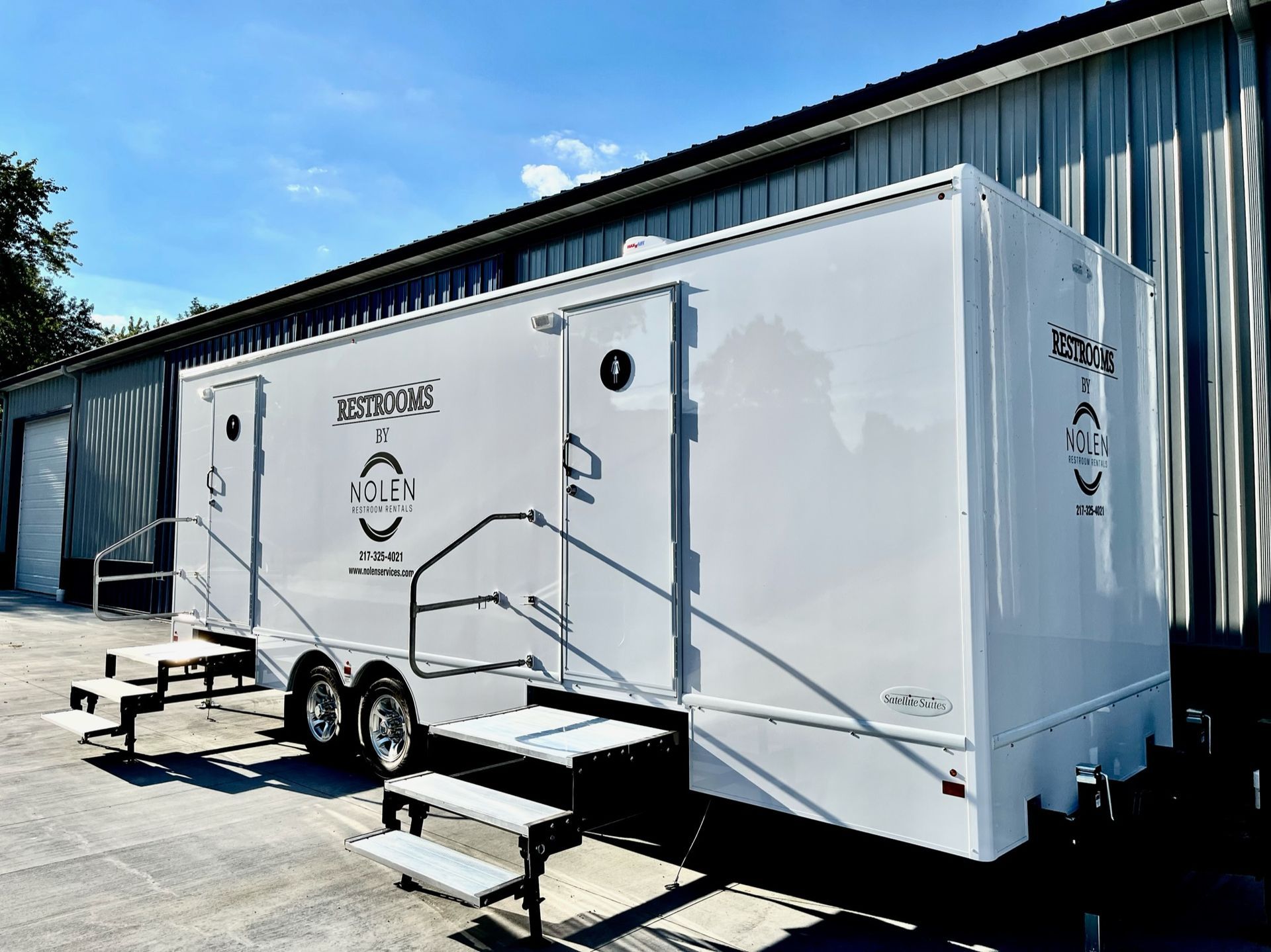 Nolen Services’ Luxury Restroom Trailers are the perfect option to complete your outdoor event or construction site and add the comfort and amenities of home. Sizing options ranging from 2 stall through 10 stall, we have the restroom trailer to fit your needs. Each trailer is equipped with heat, A/C, running water, hot water sinks, flushing toilets, Bluetooth stereo systems, winter packages, on board fresh water, and on-board wastewater.